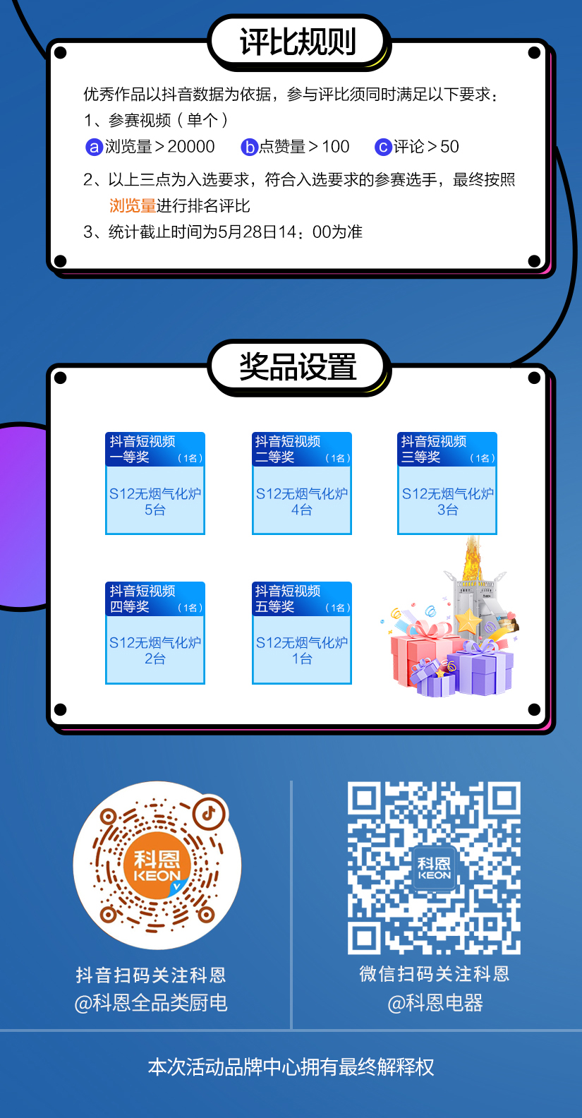 江湖風云起,爐火論英雄。快收藏這份規則秘籍。福利升級,獎品豐厚,煥新好禮帶回家。廚房江湖,等你來戰。@科恩全品類廚電官方抖音號,帶上話題 #科恩龍蝦節#科恩無煙氣化爐,定位打卡地點,即刻點燃爐火,舉起鏡頭,用一場色香味俱全的短視頻盛宴。搶占今夏流量C位!